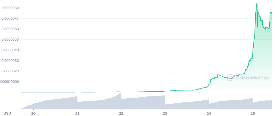 Ermolaev também destaca o FarmerDoge (CROP) que obteve ganhos mensais incríveis, aumentando em 3.844,38% nos últimos 30 dias. No momento em que este artigo foi escrito, o CROP era negociado a $ 0,008346, uma ligeira queda de 1,7% nas últimas 24 horas.